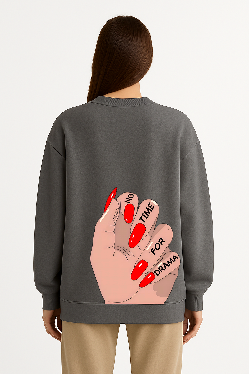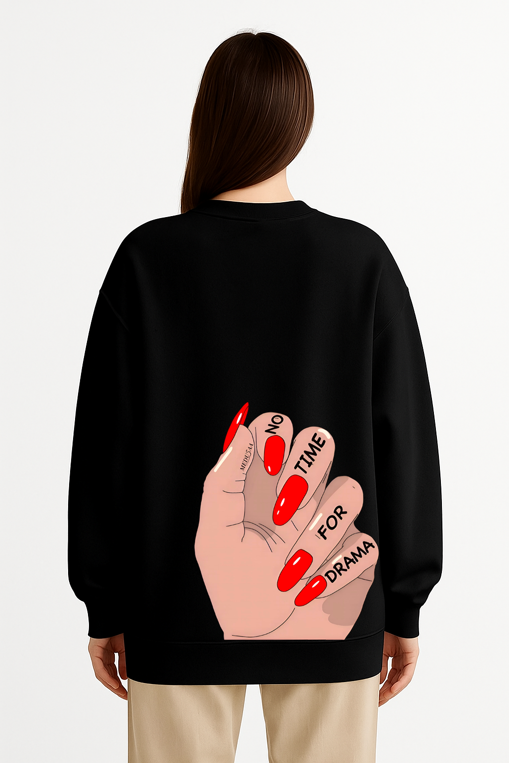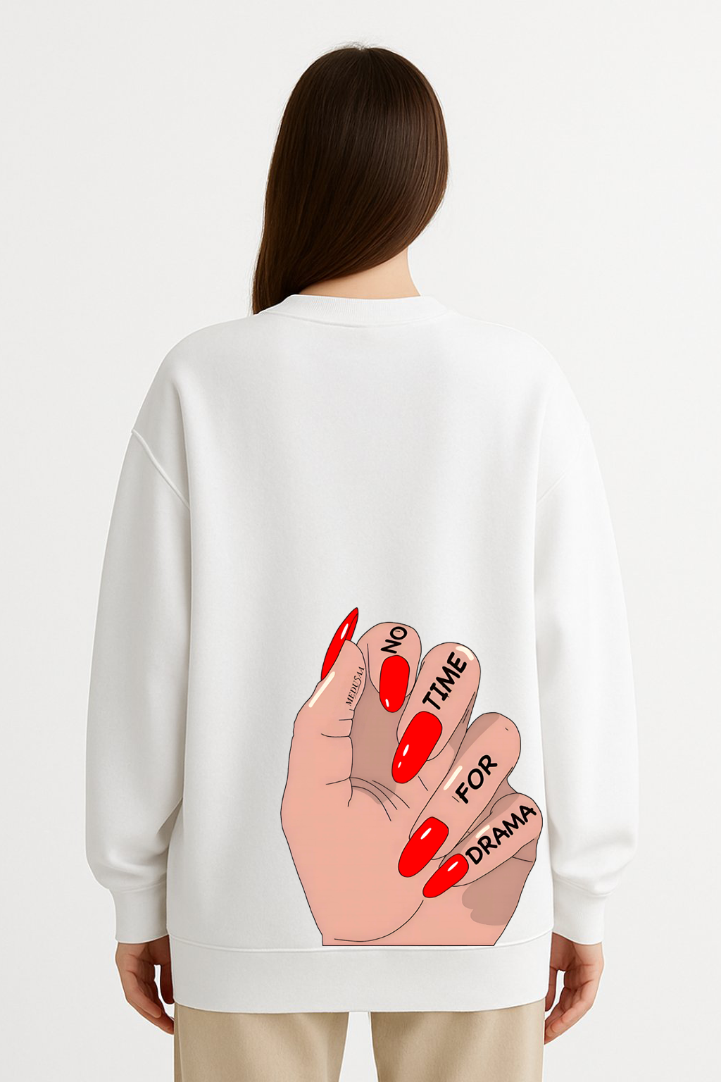 Ενα γυναικείο χέρι με κόκκινα νύχια και τη φράση “No Time for Drama” — αυτή η μπλούζα αποπνέει αυτοπεποίθηση, στυλ και attitude.