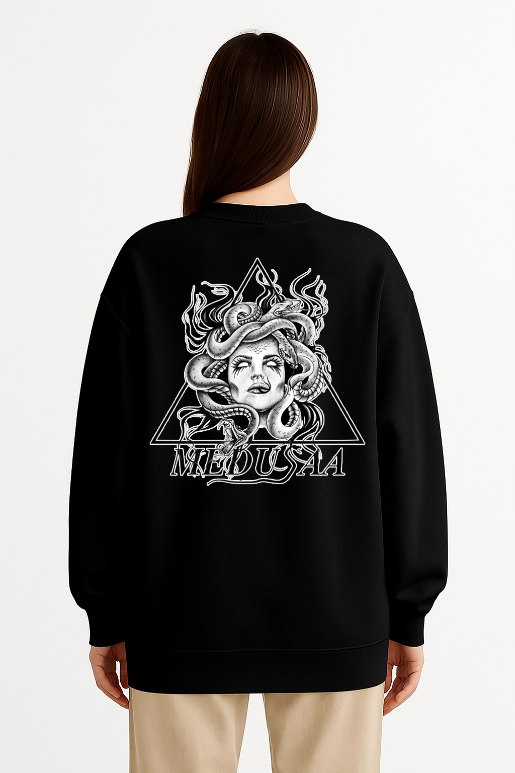 Το φούτερ Medusaa φέρει το εμβληματικό σύμβολο του brand μια μορφή της Medusaa, δυναμική και υπνωτική, με φίδια να ξεδιπλώνονται γύρω από το πρόσωπό της.